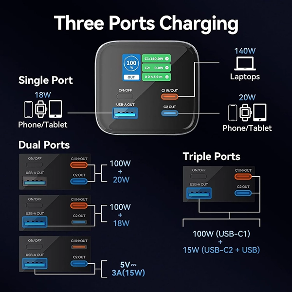 - 140W USB-C1 input/output supports PD3.1 for fast charging laptops